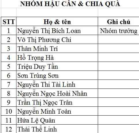 [li]Nhóm hậu cần: Trang trí sân khấu, dọn dẹp vệ sinh xung quanh, phân chia quà bánh.[/li]