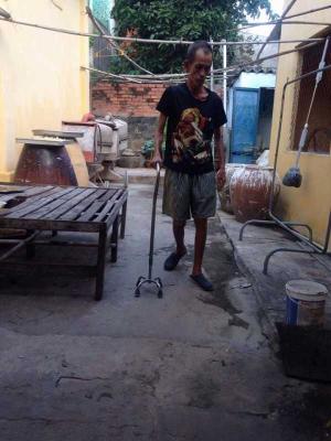 Chú Ban vịn gậy để tập đi lại