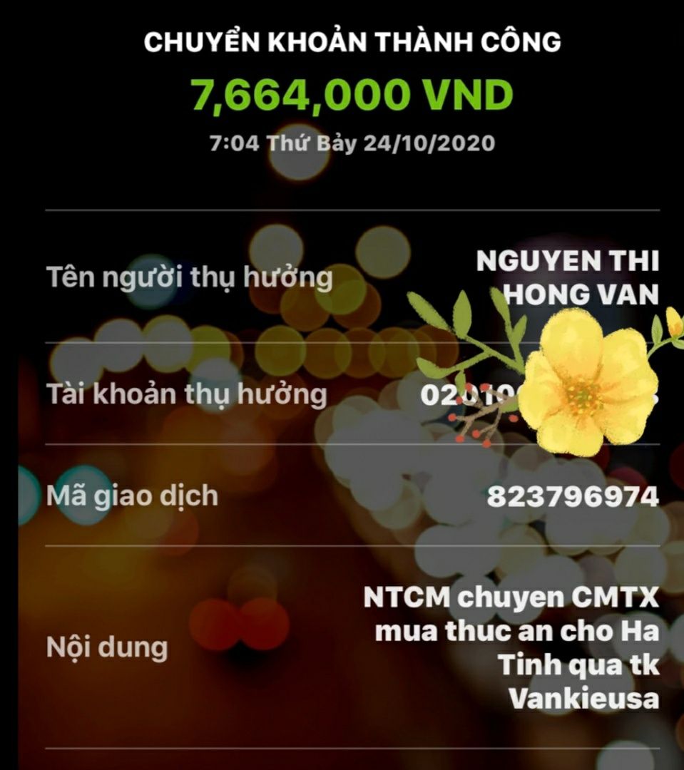 @Thocon : Em xuất quỹ chuyển tới Vânkiêusa 7,664,000đ tiền mua Gạo và các nhu yếu phẩm để CMTX tháng 10/2020 các hoàn cảnh khó khăn mà NTCM chúng ta đang giúp đỡ tại Hà Tĩnh dùm nhé.