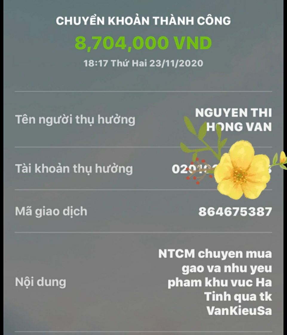 @Thocon : Em xuất quỹ chuyển tới Vânkiêusa 8,704,000đ tiền mua Gạo cùng các nhu yếu phẩm tháng 11/2020 cho bà con khu vực Hà Tĩnh dùm.