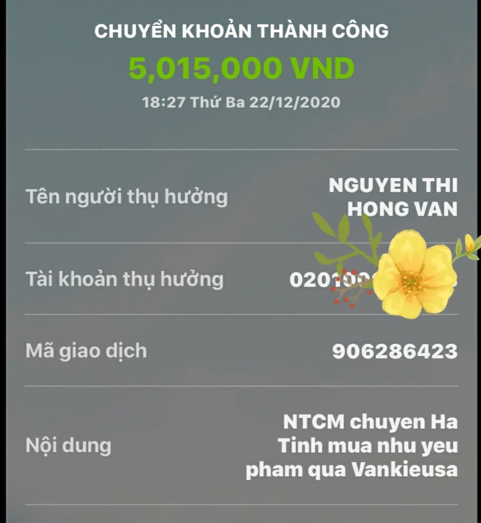 Thocon đã chuyển tiền tới Vânkiêusa rồi các bạn nhé. Nhờ Vânkiêusa và các bạn khu vực Hà Tĩnh mua hàng hóa giúp đỡ bà con tháng 122020 dùm nha.