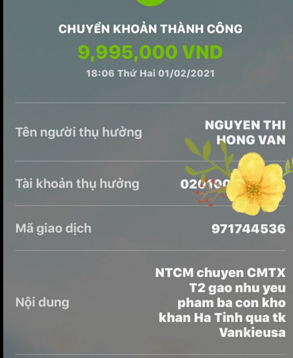 6x đã chuyển Thocon tiền mua Gạo và các nhu yếu phẩm khác tháng 2/2021 cho 7 hoàn cảnh khó khăn tại Hà Tĩnh như đề nghị của Vânkiêusa rồi các bạn nhé.