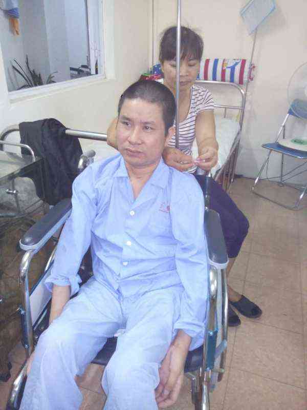 - Trong một lần đi làm, anh Tuyến bị dầm bê tông rơi vào người gây nên chấn thương tủy cổ, sau nhiều lần chữa chạy, đến nay anh Tuyến đang điều trị tại Bệnh viện Phục hồi chức năng Hà Nội được hơn 4 tháng. Do bị chấn thương tủy cổ nên anh không đi lại được, chân tay bị tê liệt rất khó cử động, phải ngồi trên xe lăn, mọi sinh hoạt hằng ngày đều do vợ anh chăm sóc. Hai vợ chồng phải ở bệnh viện chăm nhau nên con ở nhà gửi cho em trai nuôi dưỡng, chăm lo học hành.