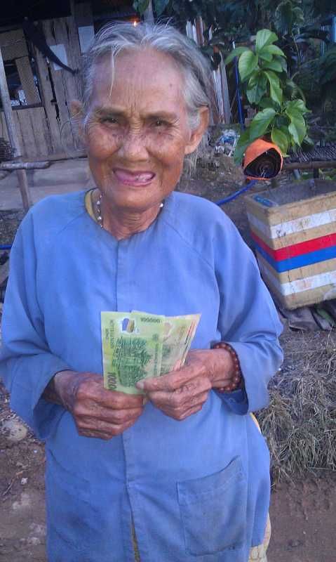 Tuần trước mình có ghé thăm bà Nở nhưng bà Nở mới bị gãy tay nên không ở nhà mà ở Vĩnh Cửu với người con gái nhưng người con gái cũng nghèo phải thuê đất ở vĩnh cữu để nuôi cá , ngươi con gái có 2 người con : Đứa đầu bị não tủy giờ phải có người nuôi còn 1 đứa nghỉ học để đi làm cùng cha. Bà Nở giờ không ăn được gì mà chỉ ăn 1 ít cháo và uống sữa. Bác y tinh có nhờ mình trao 200k CMTX cho bà Nở,lúc đầu mua 10kg hết 120k ở Định Quán và trao luôn cho anh Giỏi vì giờ a giỏi chỉ ngồi 1 chỗ còn 80k mình về Vĩnh Cửu trao luôn cho bà Nở là 100k ( mình cho 20k cjo chẵn ) . giờ bà nở rất khó khăn nên mong cả nhà giúp thêm CMTX là khoảng 500k để mua sữa cho bà.