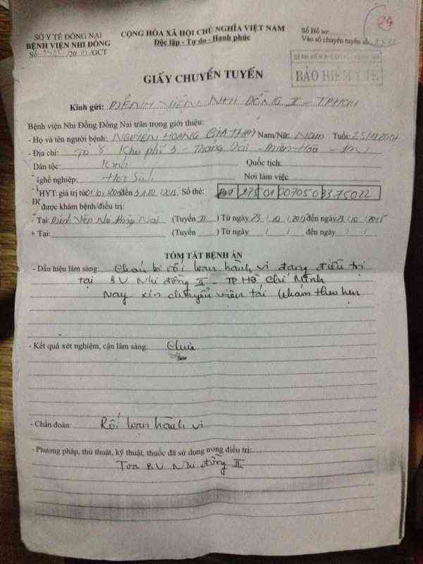 -Em tên Nguyễn Hoàng Gia Thái, sinh năm 2007, nhà ở Trảng Dài- Biên Hòa - Đồng Nai. Từ khi mới sinh ra, em đã bị chứng rối loạn hành vi do di chứng của bại não, đến giờ vẫn chưa biết nói, yếu nữa người, mọi sinh hoạt đều do người bà chăm sóc do cha mẹ của em đã bỏ đi cả rồi. Dù đã 8 tuổi nhưng em chỉ nặng có 15.5kg. Thời gian trước 2 bà cháu nằm điều trị ở BV Nhi Đồng 2, bà thì đi bán vé số ở Coopmart Nguyễn Đình Chiểu, nhưng do bên đó không điều trị tiếp được nên giờ đã chuyển qua BV Nhi Đồng 1 hôm thứ 7 vừa rồi.