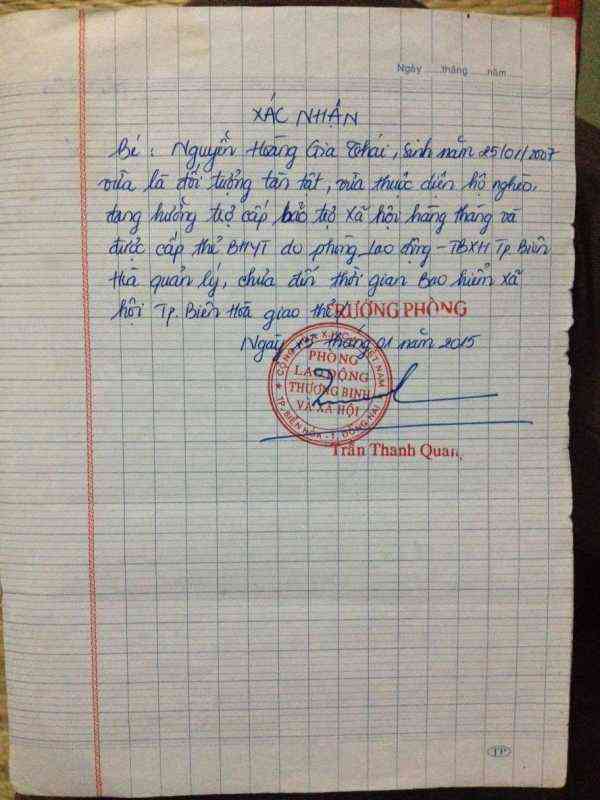 Chào cả nhà. Mình xin giới thiệu hoàn cảnh Bé Gia Thái 8 tuổi như sau ( nguồn facebook của Bạn mình https://www.facebook.com/hang.moon.428X ) Hằng Moon