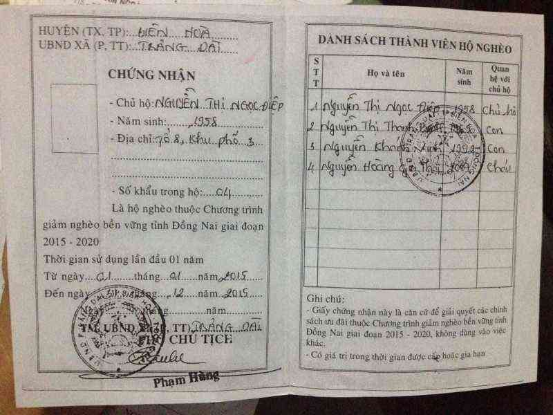 -Bà của em là Nguyễn Thị Ngọc Điệp, sinh năm 1958, bà có 3 người con, 2 trai, 1 gái. Một trai đã bỏ nhà đi, còn một trai ở nhà học nghề, con gái thì đi làm ở xa. Gia đình cũng thuộc diện hộ nghèo. Bà bị cũng nhiều bệnh như : rôi loạn chức năng tiền đình, thoái hóa cột sống thắt lưng, thoái hóa khớp gối, suy nhược cơ thể