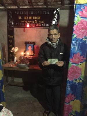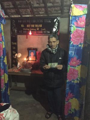 Hôm 30/12 Hoaiti có ghé thăm và trao số tiền 200.000₫ CMTX tháng 12 đến bố của chị Thanh rồi ah. Bố chị gửi lời cảm ơn cả nhà nhiều ah. Từ khi vợ và con gái mất ông Huần buồn và suy sục hẵn. Hiện nay sức khỏe của ông cũng đang rất yếu. Mong rằng ông sẽ sớm vượt qua nổi đau này ah.