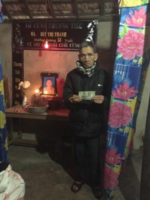 Hôm 30/12 Hoaiti có ghé thăm và trao số tiền 200.000₫ CMTX tháng 12 đến bố của chị Thanh rồi ah. Bố chị gửi lời cảm ơn cả nhà nhiều ah. Từ khi vợ và con gái mất ông Huần buồn và suy sục hẵn. Hiện nay sức khỏe của ông cũng đang rất yếu. Mong rằng ông sẽ sớm vượt qua nổi đau này ah.
