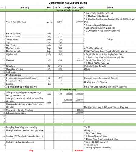 Đây là danh mục quà cần mua và đã được ủng hộ. Em xin đề xuất quỹ tạm ứng 10.000.000 VNĐ (đề phòng phát sinh chi phí) để mua bổ sung và kịp phân loại, đóng gói hàng ạ. Em cảm ơn cả nhà  :gift_heart: