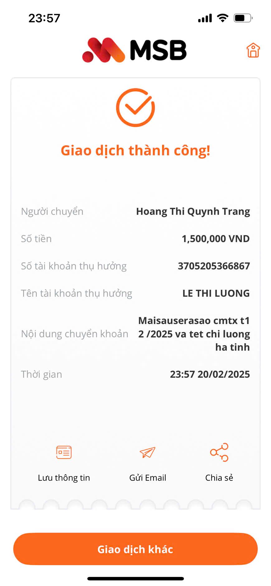 Vịt đã chuyển CMTX tháng 3/2025 từ Maisauserasao vào tài khoản chị Lương, cũng đã hết 2.000.000đ của chị Maisauserasao gửi Vịt. Nếu chị tiếp tục CMTX thì gửi tiếp Vịt trung chuyển nhé. Cảm ơn chị.