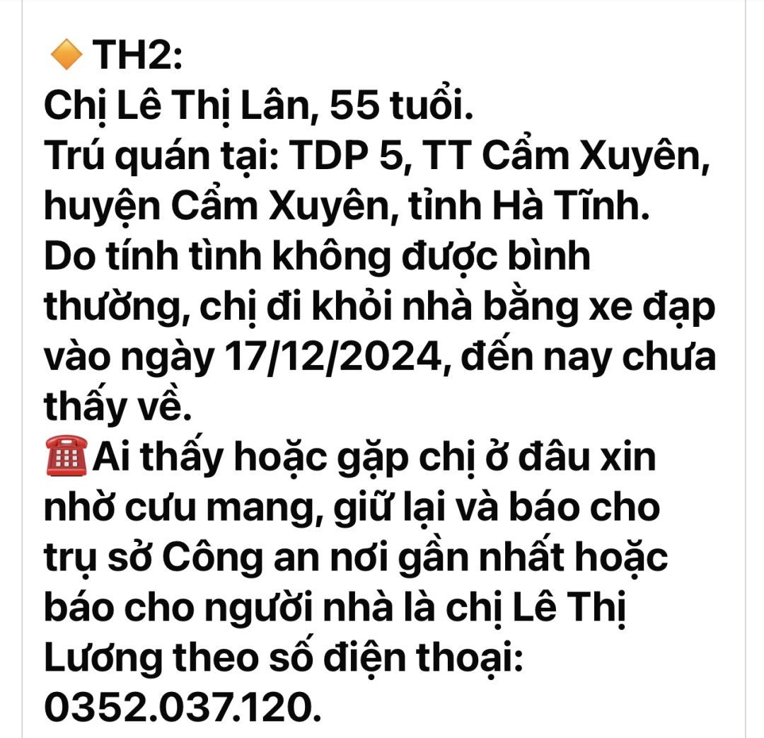 Chị Lân là chị gái chị Lương bị bệnh tâm thần lại bỏ nhà đi mấy hôm nay hiện gđ vẫn chưa tìm đc, do hoang cảnh gđ chi neo người nên chủ yếu nhờ bà con lối xóm đi tìm hộ nhưng đến nay vẫn chưa tìm đc, hiện phải nhờ đến cộng đồng bà đài truyền hình đăng tin tìm hộ