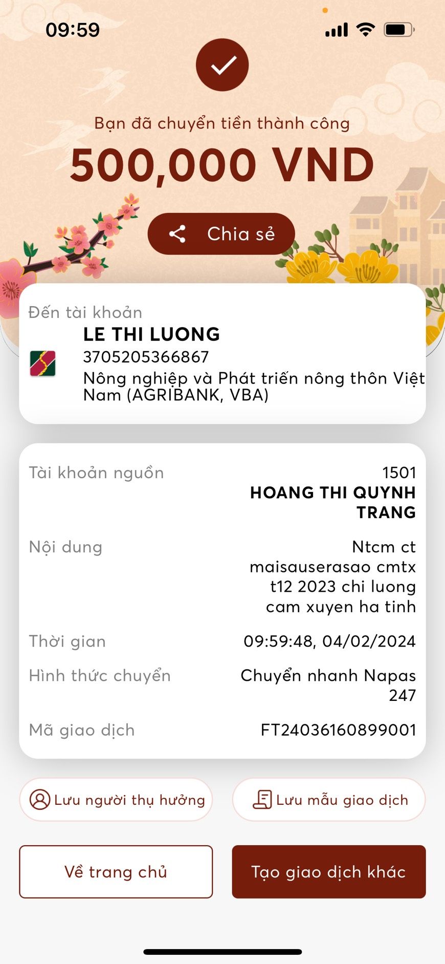 Vịt đã chuyển cmtx T8 & 9 2024 của Maisauserasao đến chị Lương, nhờ các bạn Hà Tĩnh thông tin thêm hoàn cảnh.