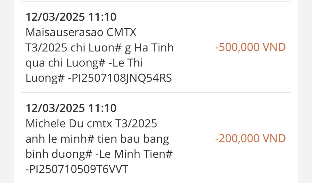 Vịt đã chuyển CMTX tháng 3/2025 từ Maisauserasao vào tài khoản chị Lương, cũng đã hết 2.000.000đ của chị Maisauserasao gửi Vịt. Nếu chị tiếp tục CMTX thì gửi tiếp Vịt trung chuyển nhé. Cảm ơn chị.