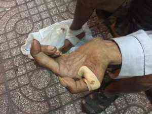 Cách đây hơn 4 năm chú Quí xin vào làm việc tại một cơ sở gia công Bì lợn, lúc làm việc do không mang đồ bảo hộ nên chú đã bị hóa chất làm chân bị hoại tử, nằm viện một thời gian để điều trị nhưng không hết. Thời gian điều trị ở bệnh viên chú đã tiêm nhiều thuốc bên cánh tay trái nên tay trái đã bị biến dạng.