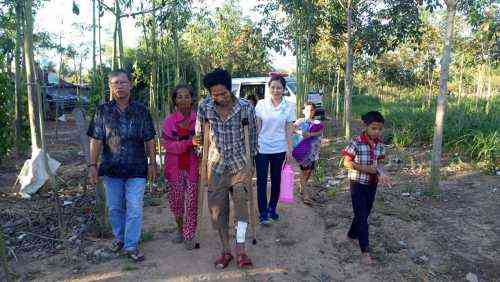 Phòng CTXH bệnh viện Bà Rịa tặng cặp nạng cho anh Trường. Anh Trường đi nạng từ xe vào nhà