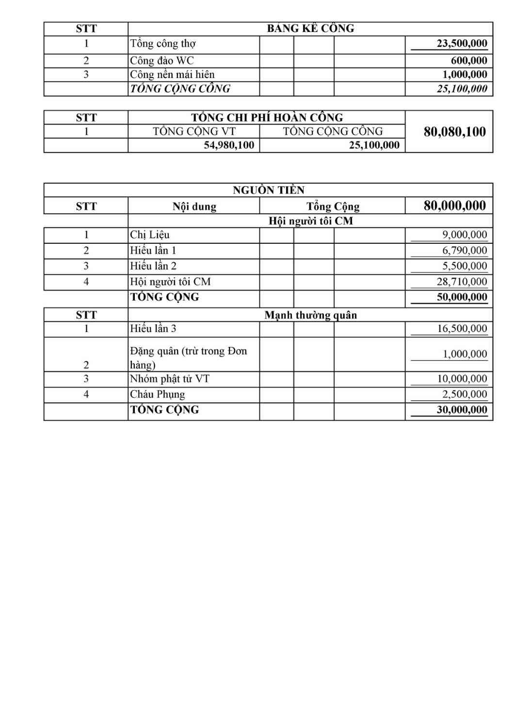 Vậy Quỹ NTCM còn phải xuất quỹ: 4.035k trong số tiền dự tính ban đầu là 50.000k. Phần nợ còn lại hơn 13.785k, chú Hiếu sẽ lo kêu gọi thêm MTQ ủng hộ.