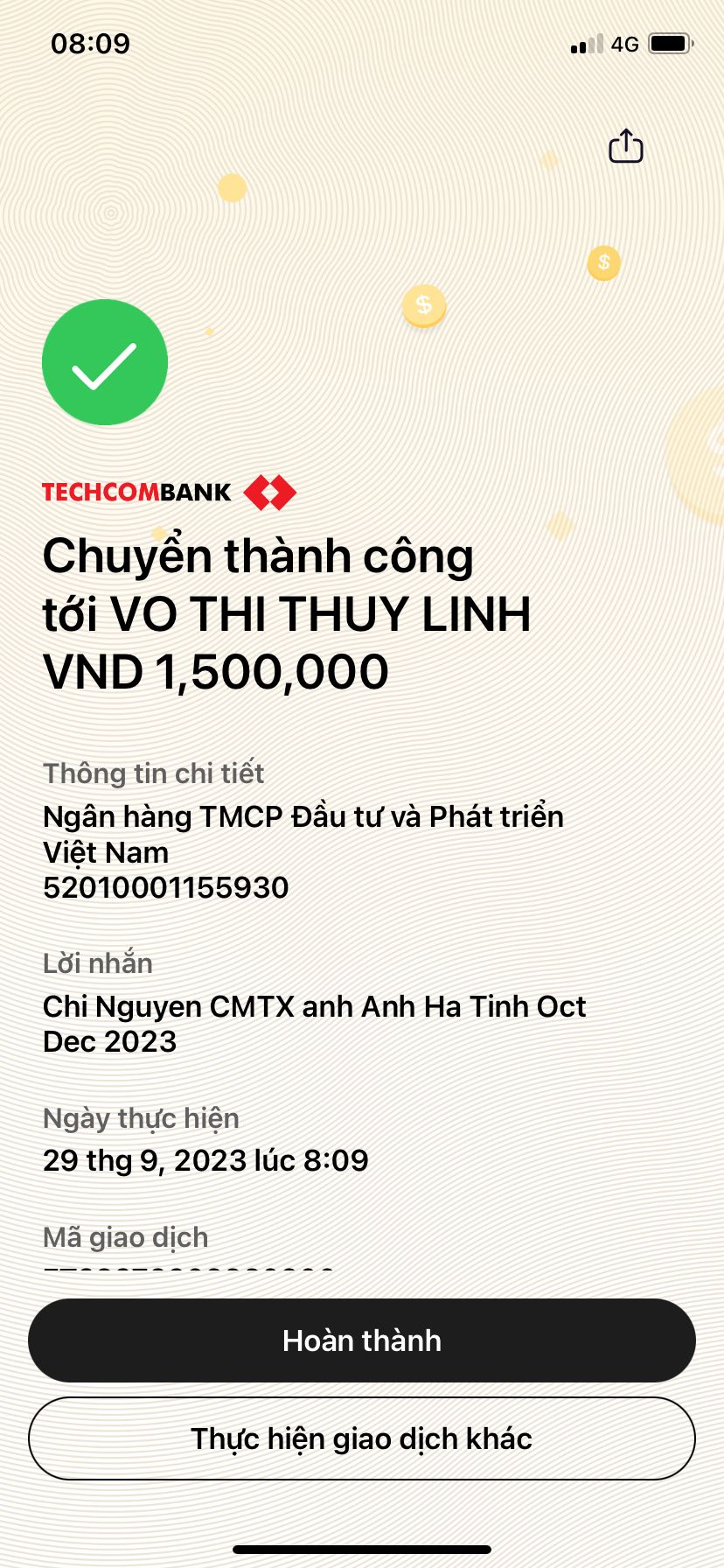 Được biết gần đây Thuỳ Linh Võ nhận chuyển CMTX tới anh Ánh nên khoản CMTX từ Chi Nguyen sẽ chuyển tới Linh luôn. (1,500,000 VND cho 3 tháng 7-8-9/2023).