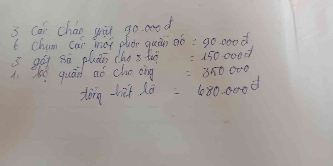 -   Châu giặt 3 chiếc = 90 K, móc phơi quần áo 90K, bột giặt 150 K, 1 bộ quần áo cho ông cụ 350K