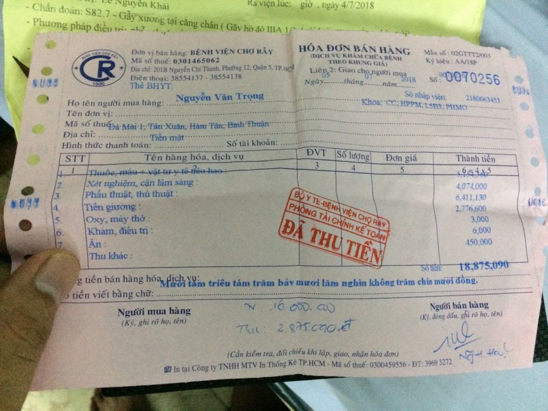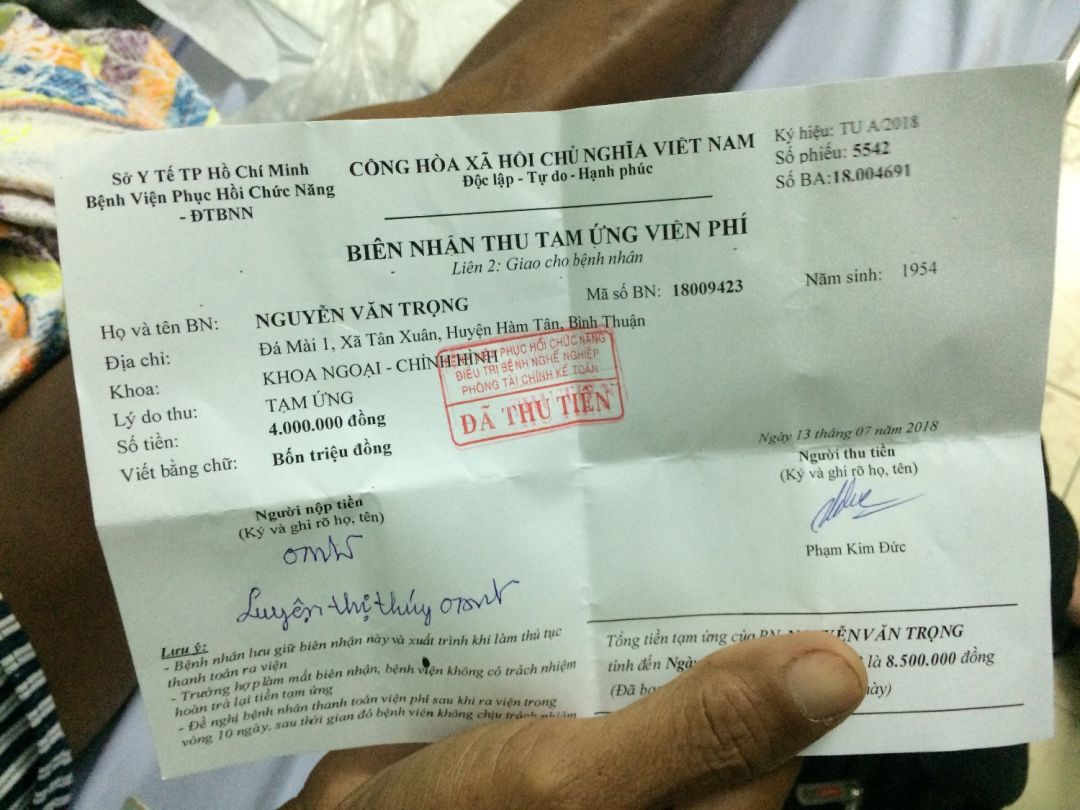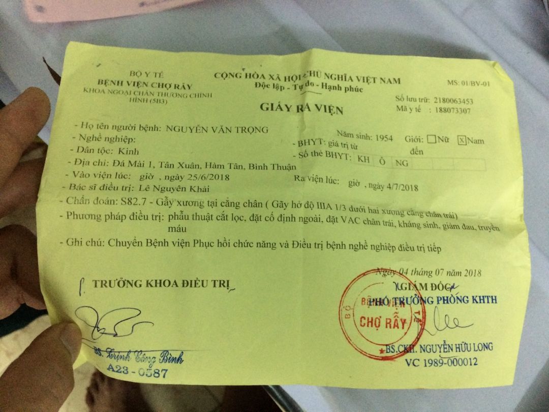 Chú bị xe tông ở quê, gia đình chuyển lên bệnh viện Chợ Rẫy để phẫu thuật xếp xương lại. Sau đó chú được chuyển sang bệnh viện phục hồi chức năng quận 8 để điều trị tiếp tục.