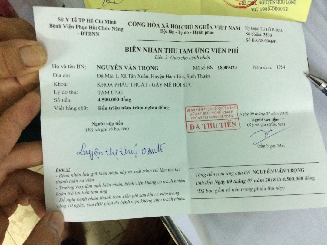 Hiện chú nằm tại phòng 55 khoa bệnh viện phục hồi chức năng quận 8.