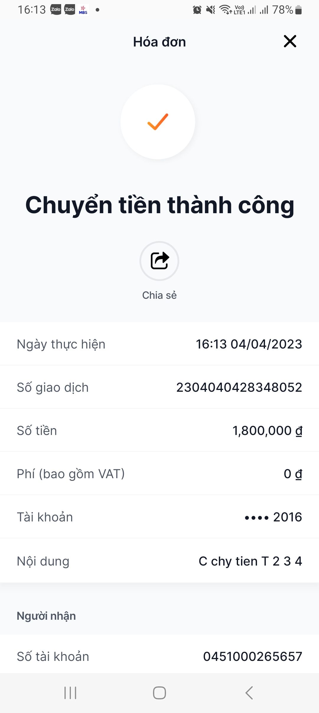 Xin chào, C chuyển tiền CMTX e B T 2 3 4 nhé.