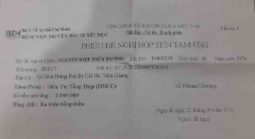 hoàn cảnh chị Dương đang gặp khó khăn về tiền đóng tạm ứng. cũng như không muốn việc điều trị bệnh suy tủy xương của chị Dương bị gián đoạn nên Mai Trâm đề nghị xuất quỹ CMKTX 3 triệu đóng viện phí.