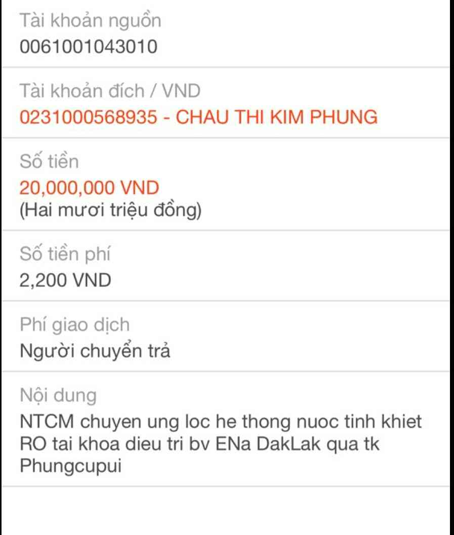 @Thocon : Em xuất quỹ chuyển đến Phung_cupui 20,000,000đ tiền tạm ứng để thực hiện việc lắp đặt hệ thống lọc nước tinh khiết RO tại khoa điều trị bệnh Phong Ea Na dùm nhé.