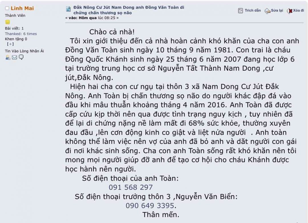 tôi tên là đồng văn thuấn hiện tại ở thôn 3, xã nam dong, huyện cư jut, tỉnh dak nông.là người cùng thôn với anh toàn,tôi xin xác minh chị mai linh viết và gửi cho web từ thiện của nhóm nguoitoicuumang là đúng hoàn toàn. Gia đình toàn thuộc vào diện hộ nghèo của xã,có 4 người vợ chồng và 2 đứa con.Vào tháng 3 năm 2016 Đồng Văn Toàn có mâu thuẫn với anh đạt và bị đập đá vào đầu làm vỡ hộp sọ, được đưa vào bệnh viện đa khoa tỉnh dak lak để cấp cứu . Sau đó được chuyển lên bệnh viện chợ rẫy điều trị trong khoảng thời gian dài. Gia đình nghèo không có tiền chữa trị phải đi vay mượn khắp nơi ,nên vợ dẫn theo con gái bỏ đi , còn con trai 12 tuổi học lớp 6 trường thcs Nguyễn Tất Thành. Toàn bị 68% thương tật , bị động kinh và liệt luôn tay bên trái . Nên mọi việc sinh hoạt hàng ngày hết sức khó khăn.Con trai còn nhỏ mà toàn lại không có khả năng lao động nên sống nhờ sự giúp đỡ trợ cấp xã hội hàng tháng. Nên tôi rất mong ban hội sẽ giúp đỡ cho toàn có cuộc sống tốt hơn, để con toàn có điều kiện học hành tiếp . Tôi xin chân thành cảm ơn tới ban hội