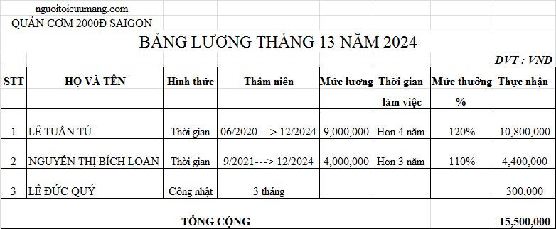 Lương T13/2024 quán cơm SG: