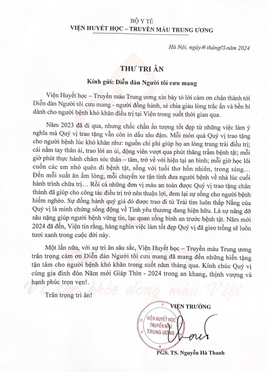 Xin gửi cả nhà Thư Tri ân từ BGĐ Viện Huyết học & Truyền máu TW ạ.