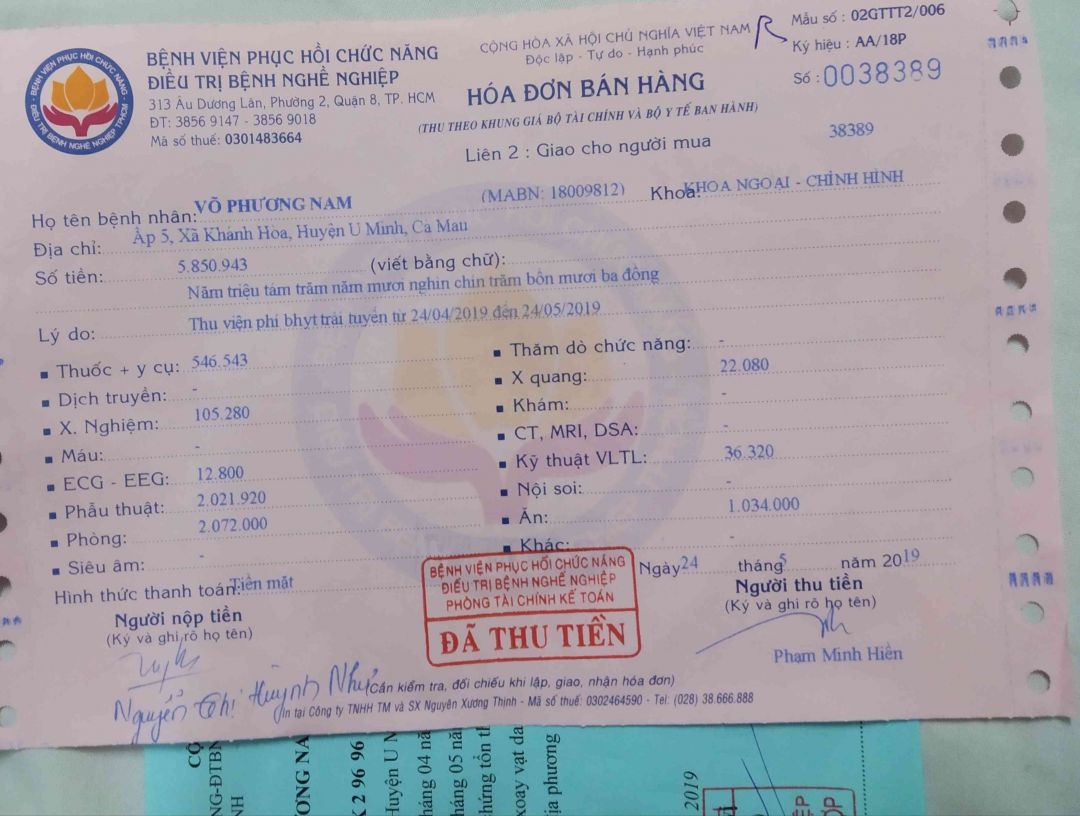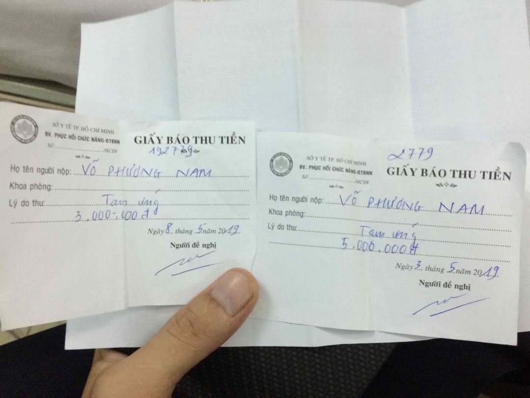 ngày10/tháng/5/2019 Em đóng 3triệu tiếp theo. tổng cộng Nam đã đóng cho bệnh viện 6triệu một trăm ngàn.như vậy là đang còn lại bệnh viện 1.900.000đ
