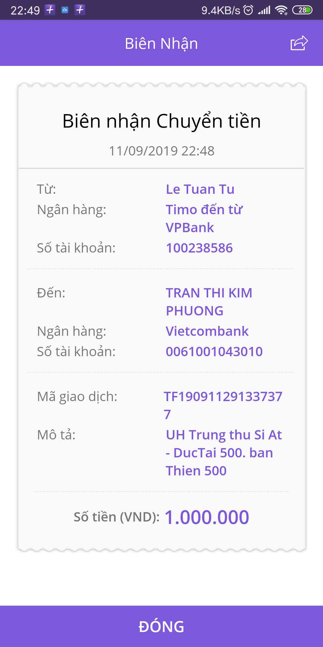 Nhờ Thủ quỹ chuyển vào TK Vietcombank của Letuantu.