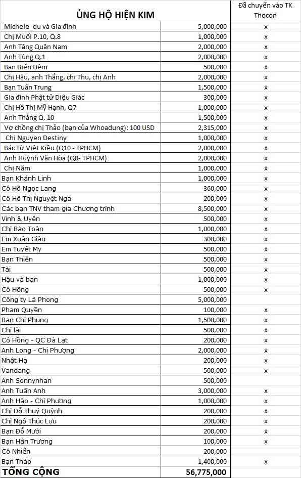 Tổng số tiền các MTQ đã ủng hộ 56,775,000đ hầu hết đã được chuyển khoản vào TK chị Thocon rồi ạ.