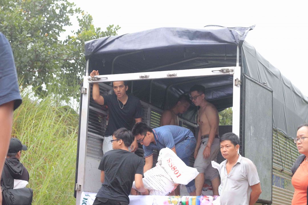 Các phần quà & lực lượng TNV sau đó được xe công nông hỗ trợ đưa vào khu vực tổ chức. Nhờ sự chung tay hỗ trợ của các nhóm, các bạn đã không ngại gian khó, cùng nhau chuyển những nhu yếu phẩm từ xe này qua xe khác, cùng nhau hỗ trợ các công việc nên chương trình diễn ra khá suôn sẻ!