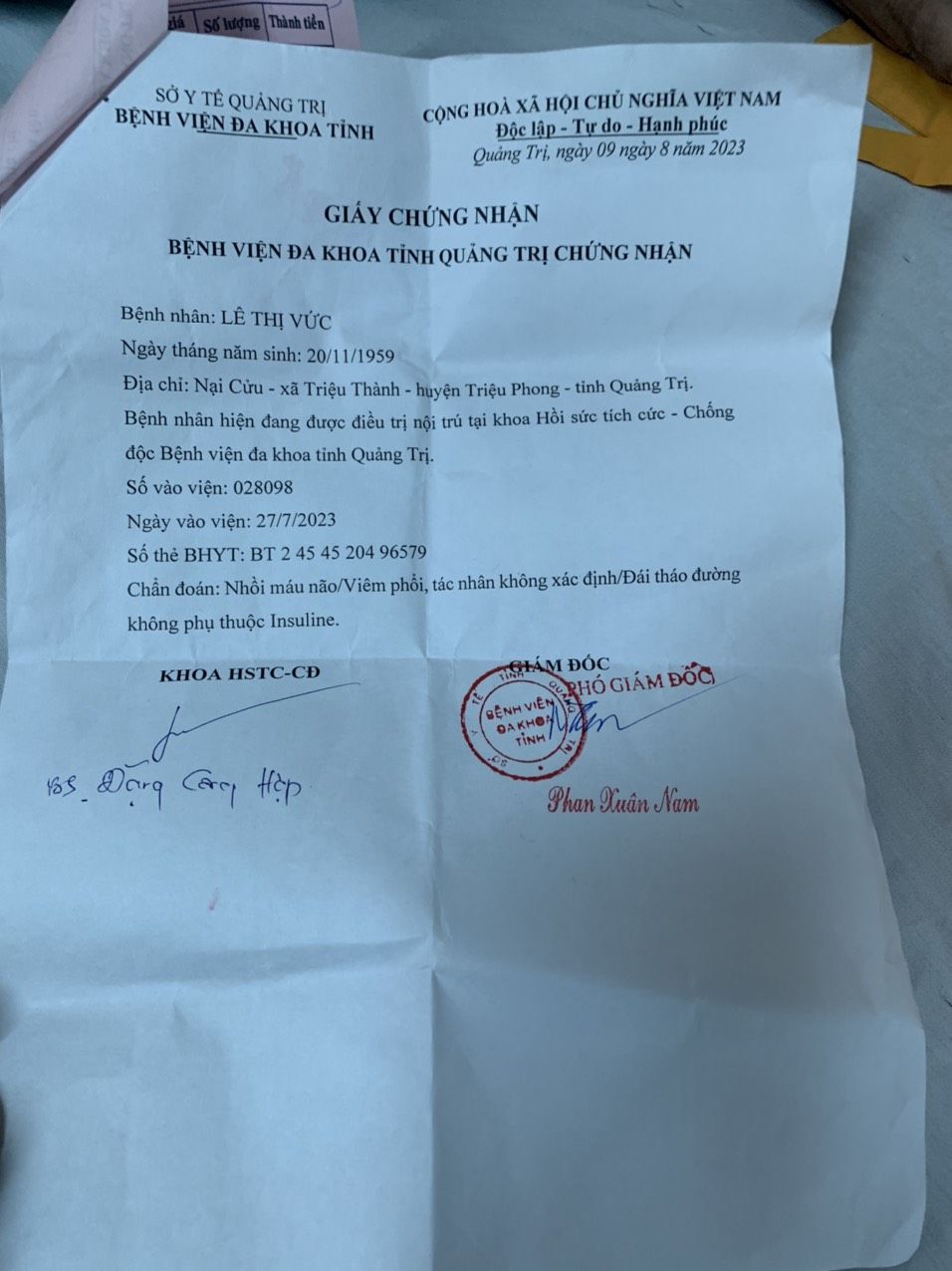 Bữa trước dragonfly cùng a Hóa đi thăm người ốm thì có gặp dì Vức đang nằm điều trị tại Khoa Hồi sức tích cực -chống độc tại bệnh viện Đa Khoa tỉnh Quảng Trị. Dì bị đột quỵ, may mà cấp cứu kịp thời, ngoài ra còn bị đái tháo đường, viêm phổi. Lúc gặp, hai anh em thấy hoàn cảnh của dì đã khó khăn càng khó khăn thêm. Bé Gấm con dì kể suốt mấy tháng nay dì bị cấp cứu đi viện 4 lần rồi. Bé thì có bầu xin nghỉ làm mấy tháng nay để chăm mẹ, dì thì không ăn được phải chuyền vào đường mũi, sức khỏe yếu dần, mà chi phí tốn kém, cứ vài ngày lại phải mua thuốc ngoài tầm 1 triệu rưỡi. Lúc đó dragonfly có gọi điện cho bác 6x để xin hỗ trợ tạm thời 1M cho dì nhưng bác không nghe máy nên cũng có hỏi ý kiến ba Phuclehuu và đã tạm ứng 1M gửi thăm dì. Mấy hôm nay sức khỏe dì càng yếu hơn, bị ra máu bẩm ở dạ dày với khạc ra máu đen. Chi phí thuốc ngoài nhiều hơn, chưa kể cơm nước, sữa, bỉm ...hằng ngày. Vậy nhóm xin đề xuất hỗ trợ thêm 5M để lo chi phí thêm cho dì Vức ạ. Mong nhận được sự ủng hộ của các MTQ cho hoàn cảnh này ạ.