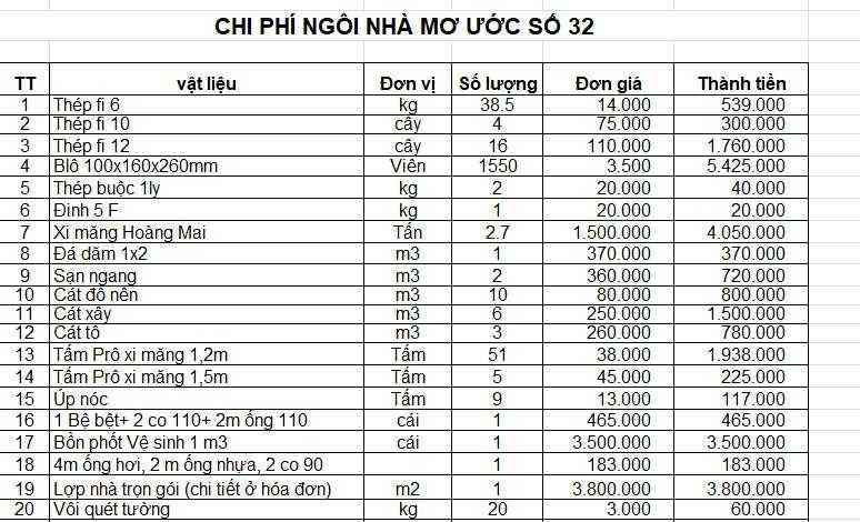 Tổng chi phí: 49.732.000 (chi tiết ở file đính kèm)+ Tạm ứng mua tặng 1 bộ bàn ghế inox mừng nhà mới: 1.2 M (đã xin ý kiến bác 6x)=50.932.000 vnđ