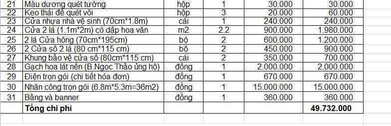 Tổng chi phí: 49.732.000 (chi tiết ở file đính kèm)+ Tạm ứng mua tặng 1 bộ bàn ghế inox mừng nhà mới: 1.2 M (đã xin ý kiến bác 6x)=50.932.000 vnđ