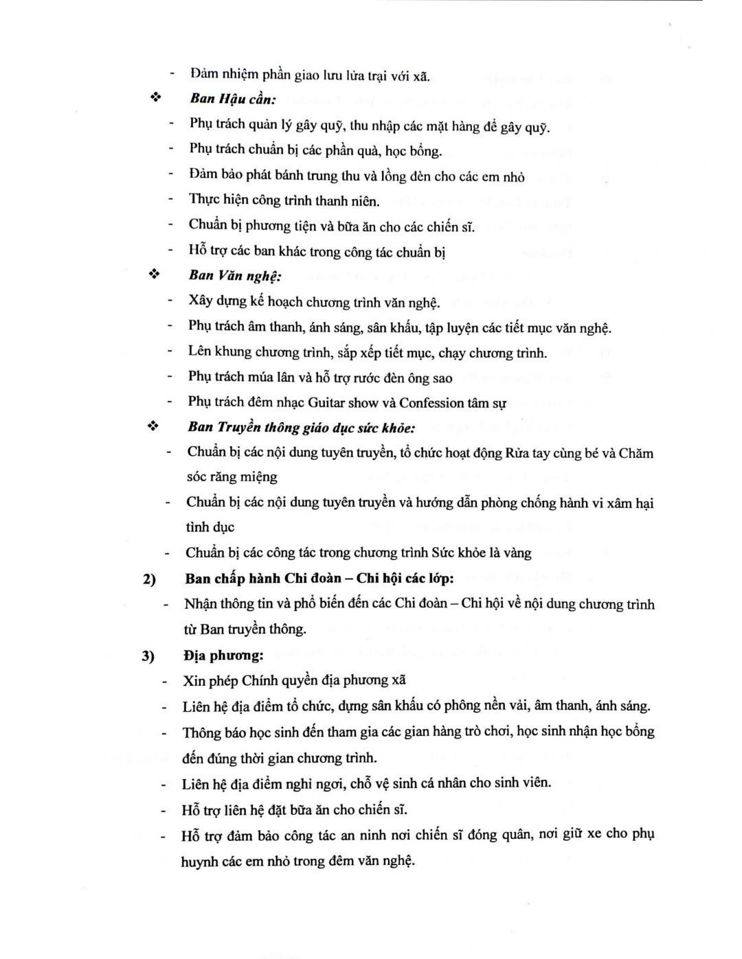 - Tổ chức và phát quà cho ngày hội trăng rằm: 2.000.000đ còn thiếu,  tổ chức theo hình thức phát quà thông qua các phiếu trò chơi sau khi các em hoàn thành 1 số lượng trò chơi tai các trạm nhất định.
