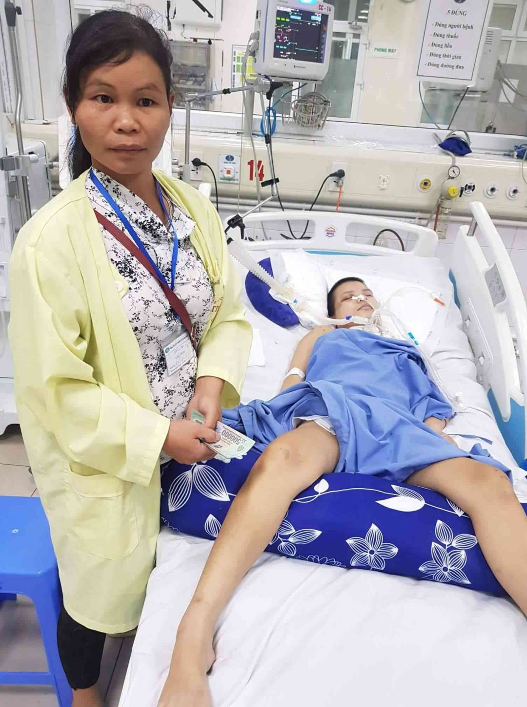" Em Hòa bị tại nạn giai thông người nhà ko biết nguyên nhân , theo người nhà chăm sóc nói hoàn cảnh khó khăn vô cùng bố mẹ ko bình thường , em đang làm mẹ đơn thân có con gái 3 tuổi . hiện tại đang nằm ở giường 14 khoa Cấp cứu bệnh viện nhiệt đới TW2 . Theo kết luận của bác sĩ em bị chấn thương sọ não nhưng chưa đến mức phải mổ mà là điều trị tích cực.