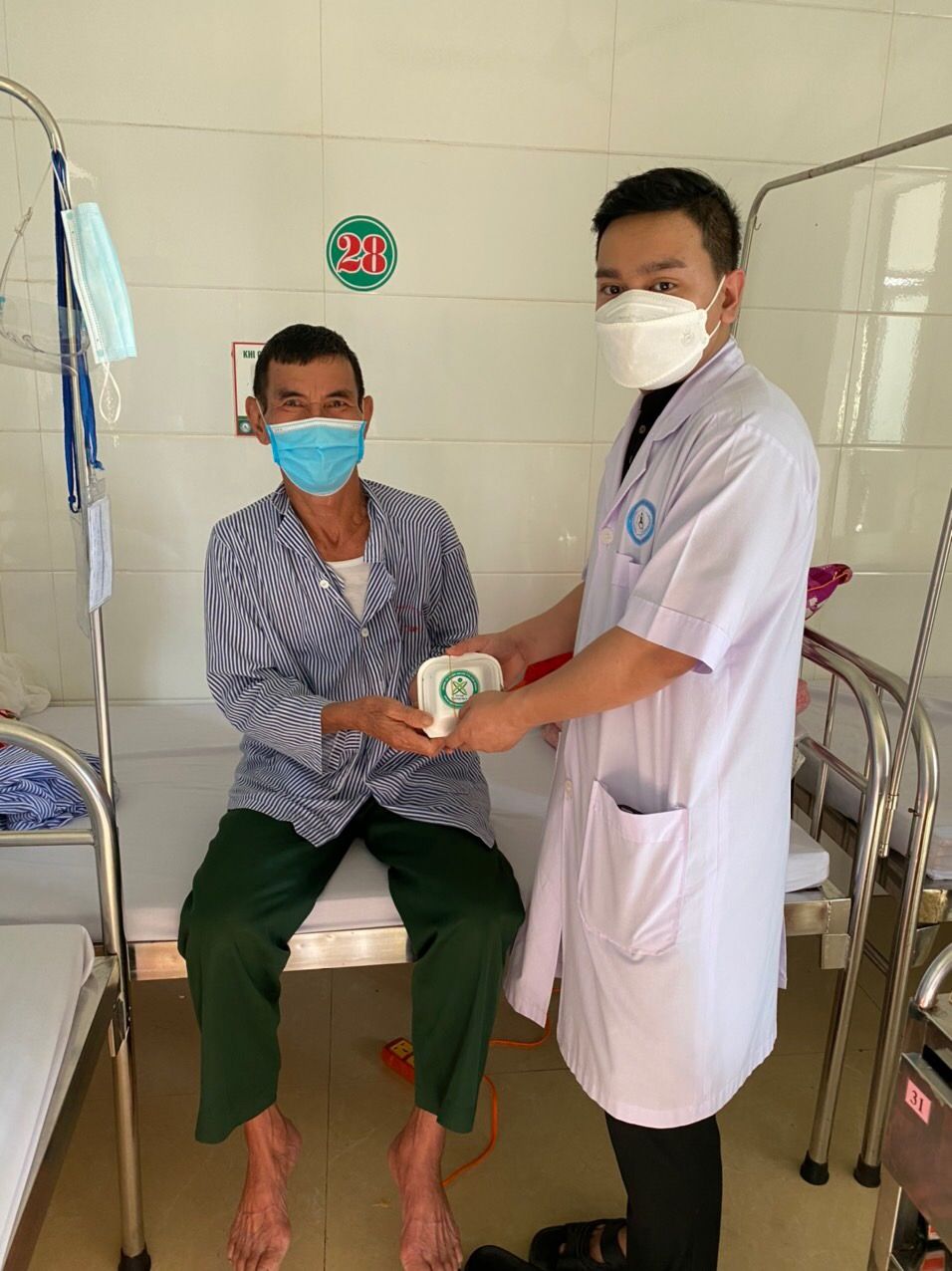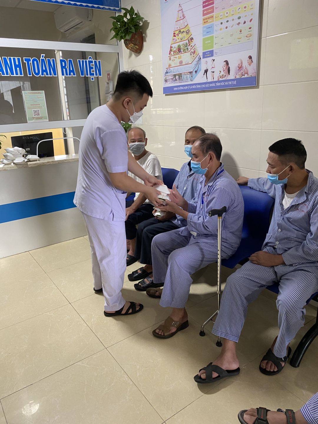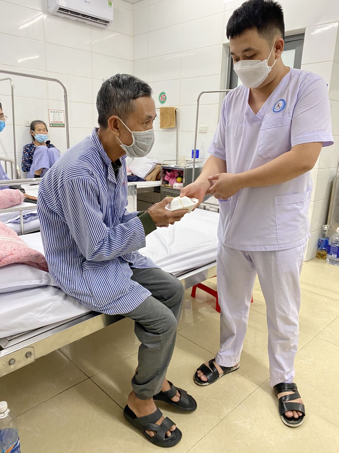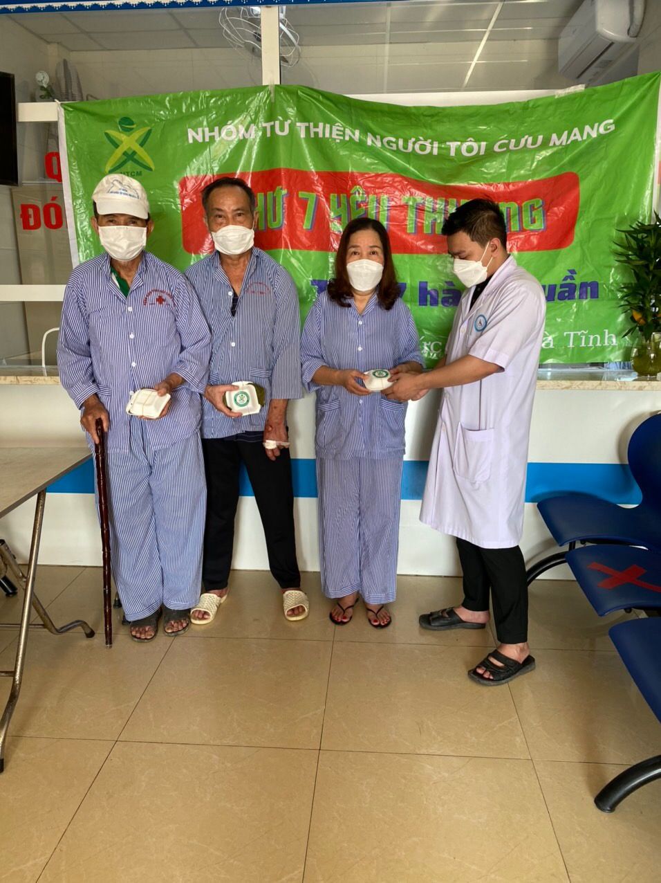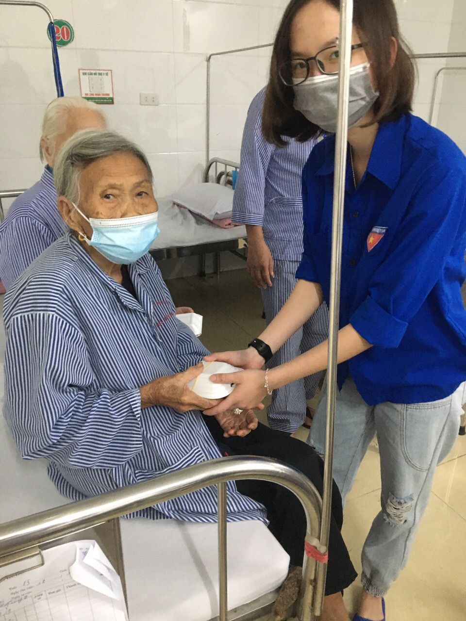 Nhưng cũng nhờ có sự hỗ trợ từ các anh chị đoàn thanh niên, các chị điều dưỡng viên hộ trợ nhận và phát cho bệnh nhân nên nhóm cũng đỡ phàn nào ngại khi phải tiếp xúc với bệnh nhân