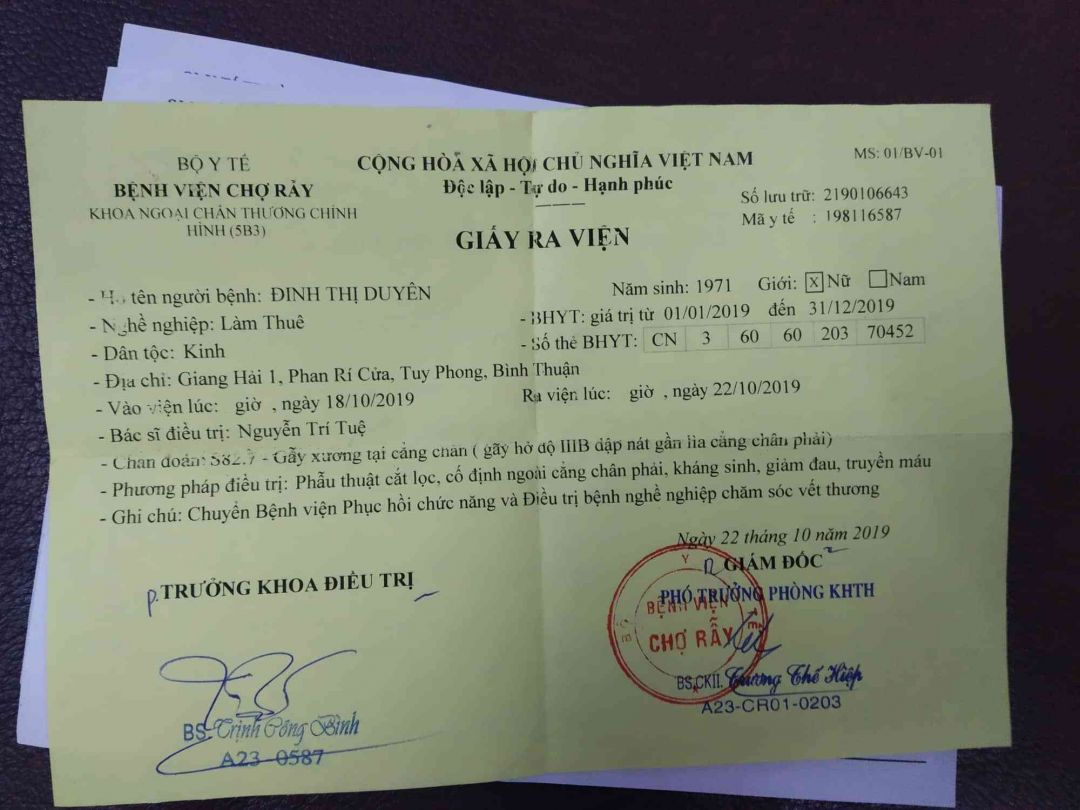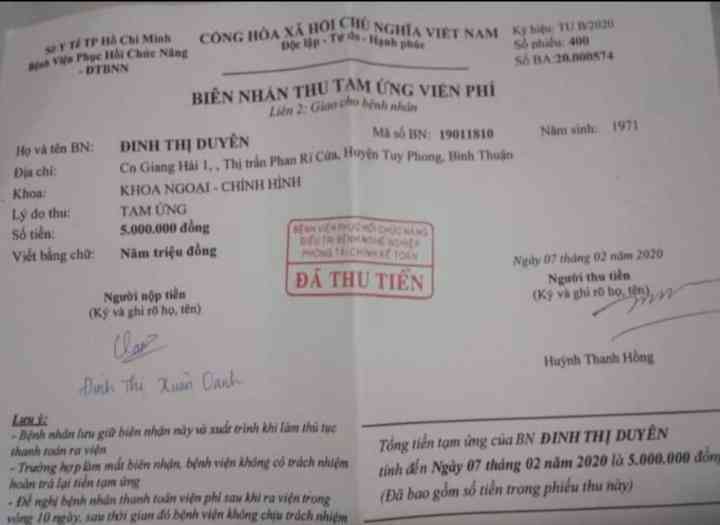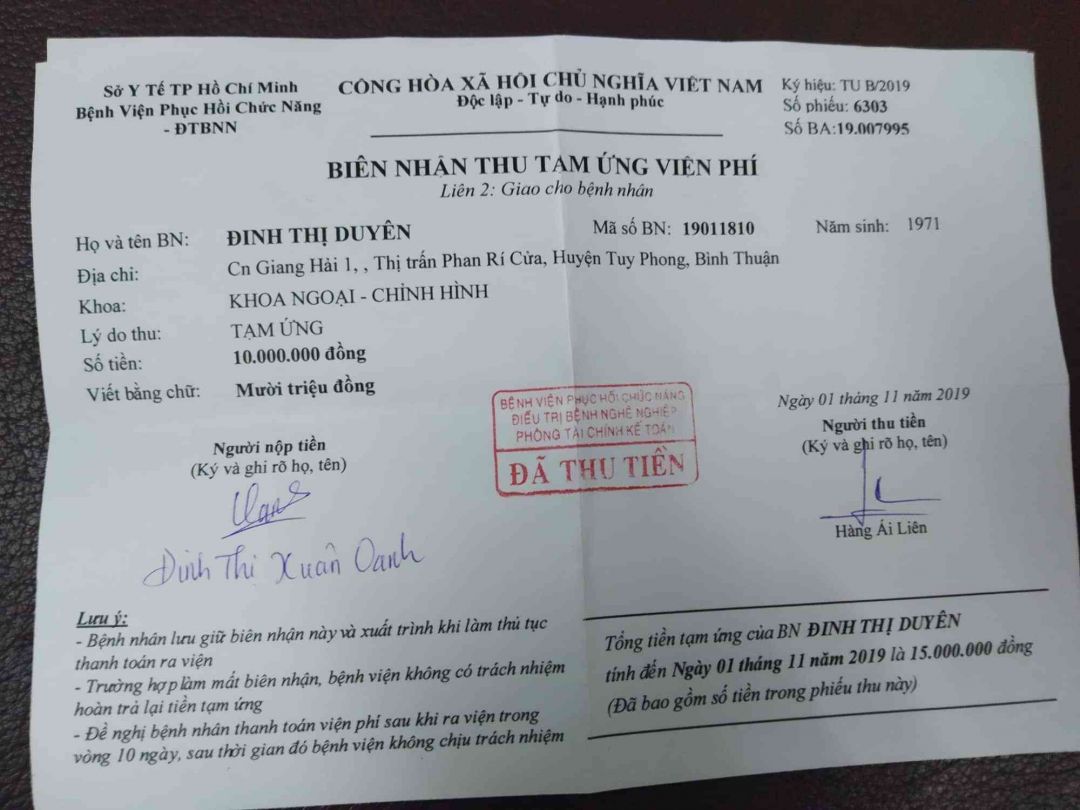 Chị xin giấy  chuyển lên BV chợ rẫy để phẫu thuật lần đầu  , được khoảng hơn một  tháng đóng tạm ứng 10.000.000₫  ,thì chuyển qua BV Phục Hồi Chức Năng Quận 8 . điều trị và theo dõi . Qua BV mới phải đóng tạm ứng hết 20.000.000₫ , chị đi mượn những người quen để có tiền đóng tạm ứng  và điều trị .