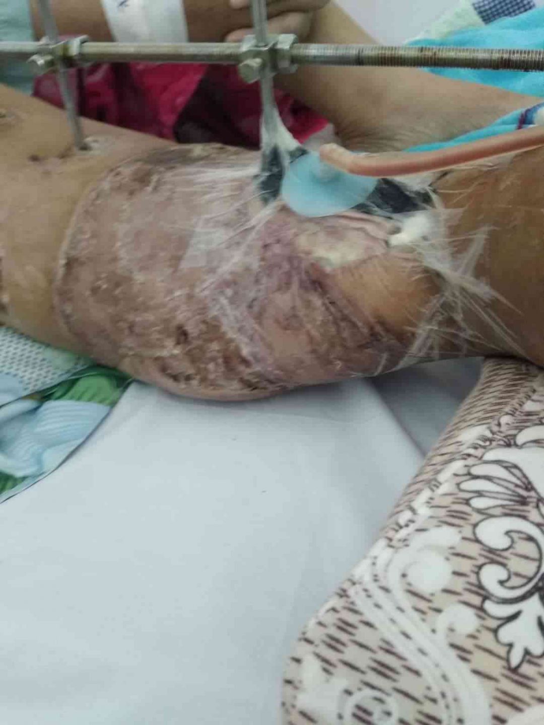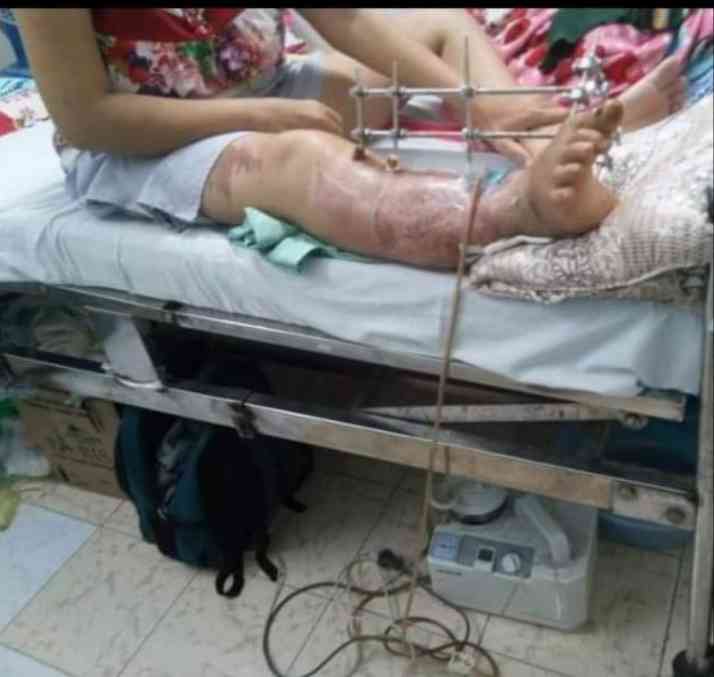 Chân chị bị dập, gãy sương, mổ và ghép xương và da đợt 1 không thành công nên hiện giờ chị phải dương thương đêt đợi đợt mổ lần 2.