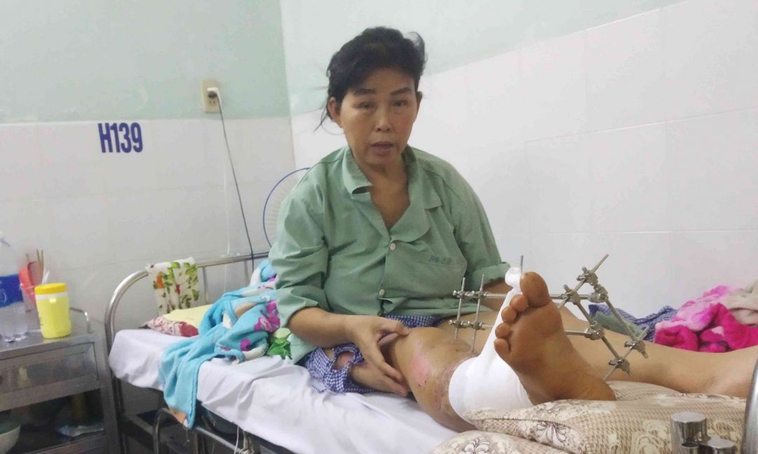 Chân chị bị dập, gãy sương, mổ và ghép xương và da đợt 1 không thành công nên hiện giờ chị phải dưỡng thương đợi đợt mổ lần 2.
