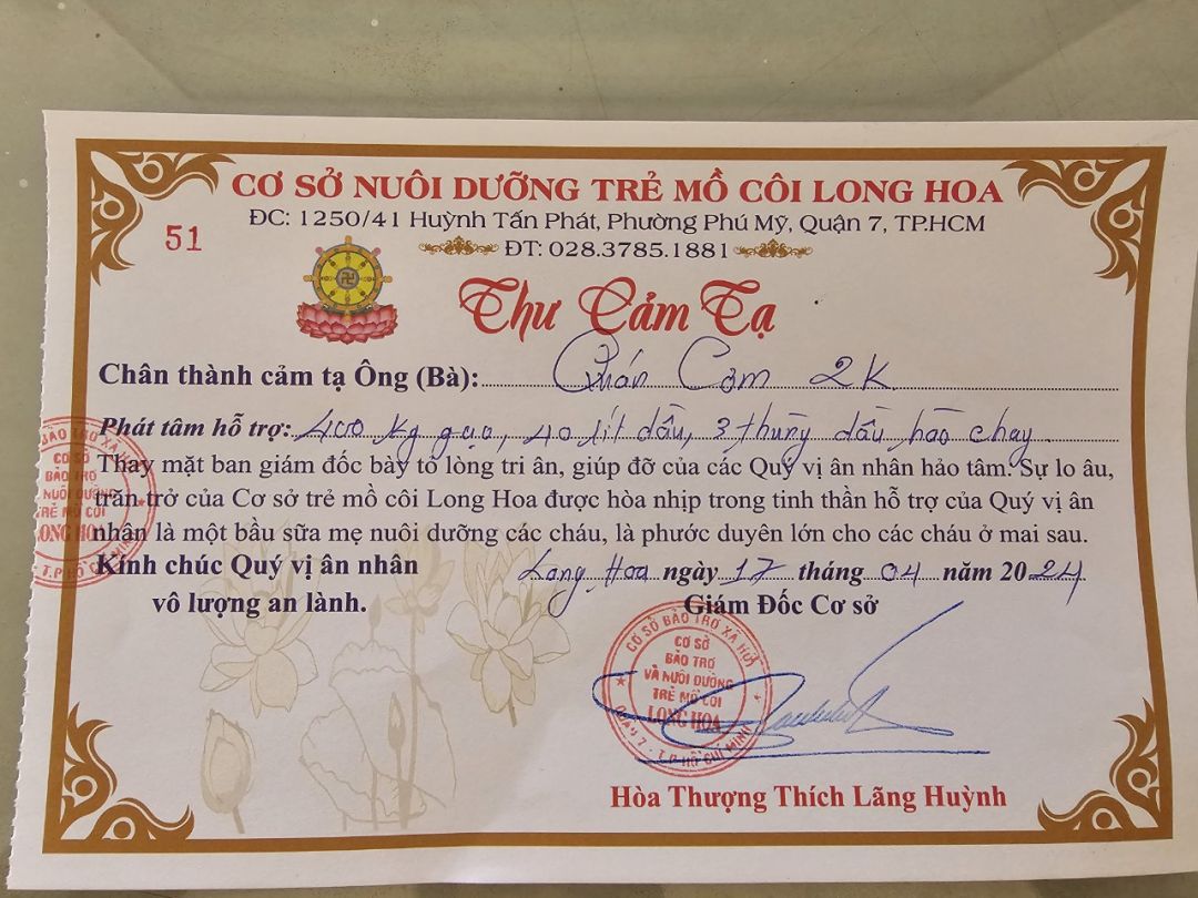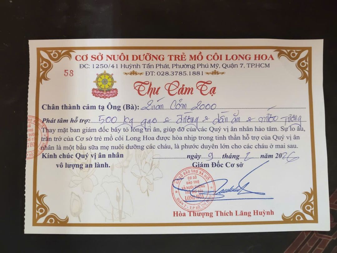 hôm qua Mai Trâm có nhận được số tiền ủng hộ của bạn Lộc Nguyễn  đến chùa Long Hoa.