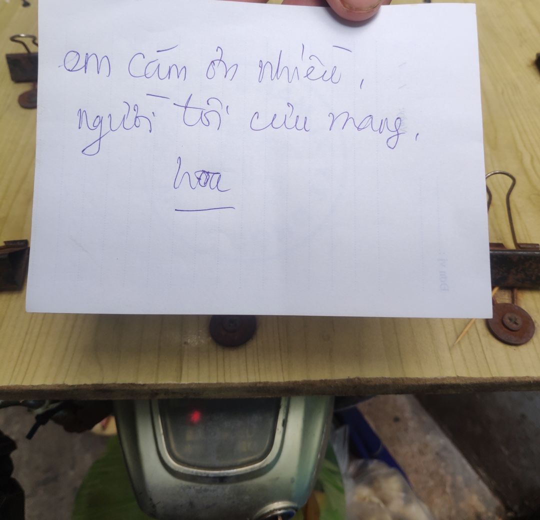 hôm nay Mai Trâm đã trao tiền CM đến tay chị Hoa rồi nhe.tình hình sức khỏe của mẹ chị cũng bình thường.còn sức khỏe của chị thì thời gian này không ổn định hay mệt.công việc mua bán tại nhà cũng bình thường.chị Hoa có viết chữ gửi lời cảm ơn.
