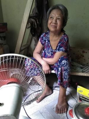 Cô bị tai biến cách đây được 10năm, vài năm sau là chồng cô mất . Đi lại rất khó khăn phải nhờ cậy vào cây gậy .