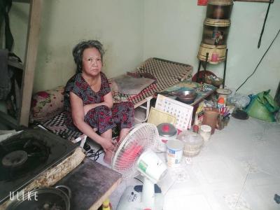 Cô bị tai biến cách đây được 10năm, vài năm sau là chồng cô mất . Đi lại rất khó khăn phải nhờ cậy vào cây gậy .