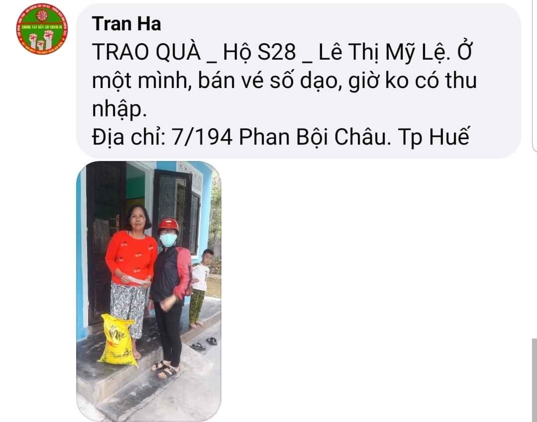 Lộc và gia đình xin được chung tay hỗ trợ chương trình 5 triệu đồng. Lộc xin cảm ơn các bạn TNV khu vực Huế đã không ngại tình hình dịch bệnh để đến với những hoàn cảnh khó khăn hiện nay. Chúc các bạn sức khỏe và an vui.