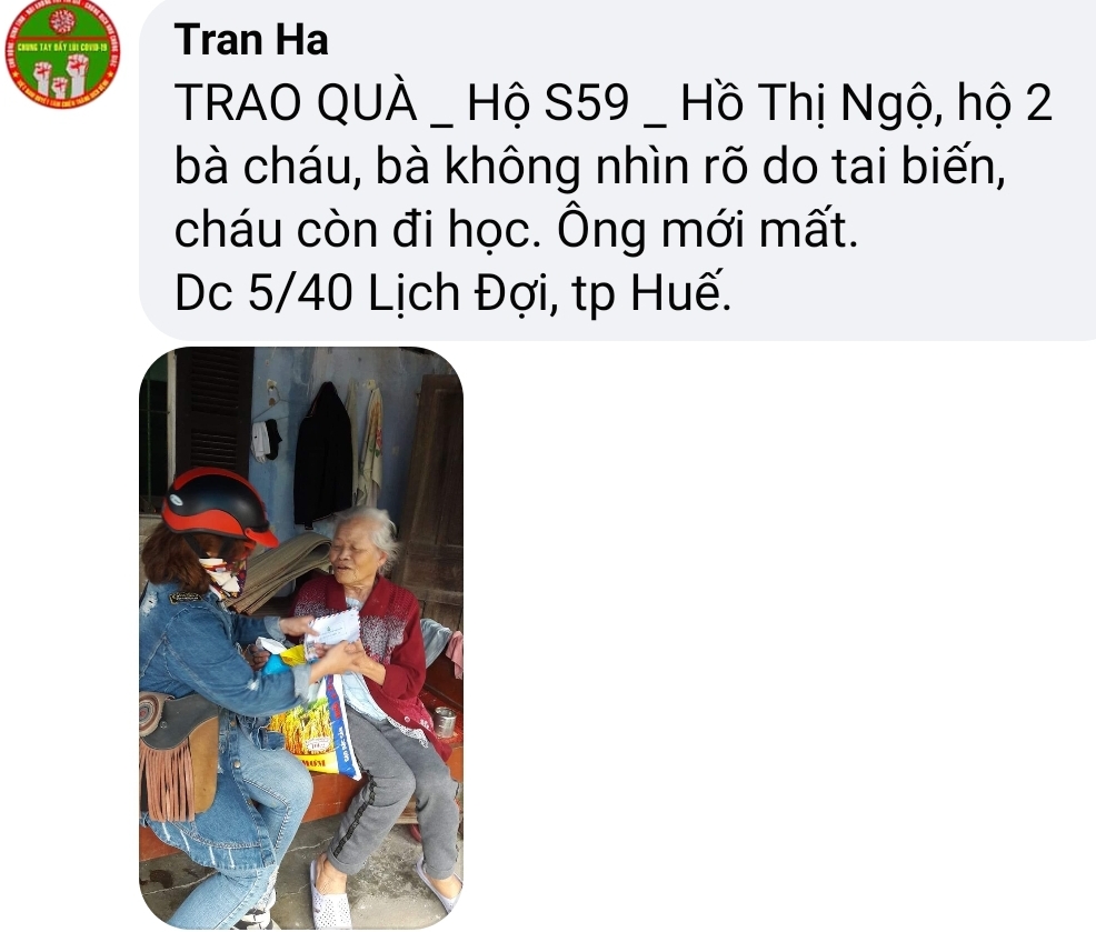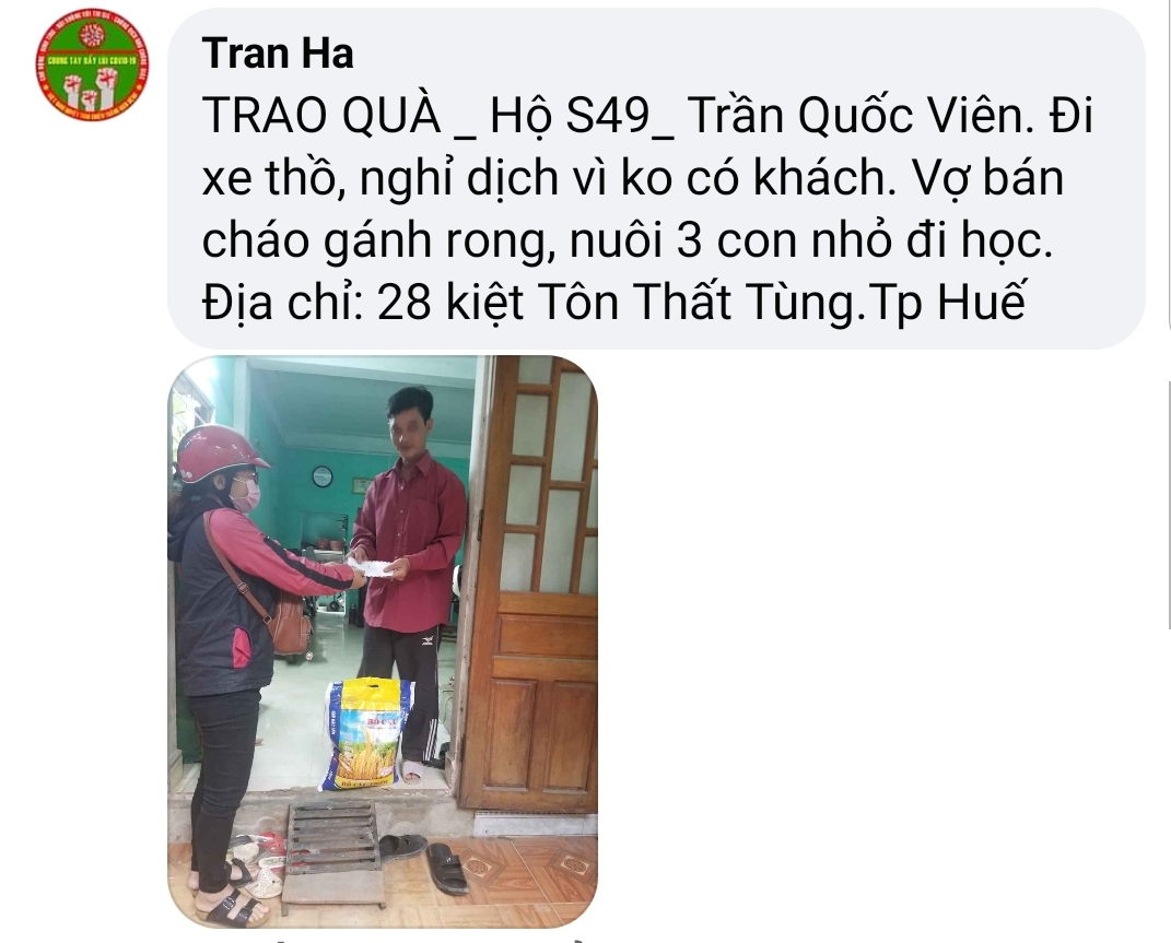Nhờ sự nhiệt tình và lăn xả của các bạn mà nhiều hoàn cảnh khó khăn tại Huế được hỗ trợ để vượt qua giai đoạn khó khăn vì dịch COVID -19 lần này.
